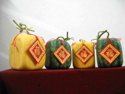 Saudara yang budiman, pada hari-hari Hari Raya Tahun baru tradisional( atau Hari Raya Tet), menurut adat- istiadat, di semua keluarga Vietnam,biasanya ada sepasang melon, karena warna merah- nya diharapkan akan mendatangkan kemujuran untuk sepanjang tahun. Pada tahun- tahun belakangan ini, melon berbentuk persegi menjadi bingkisan yang dipilih banyak orang sebagaibingkisan . Melon persegi muncul di pasar Vietnam dari tahun 2007.