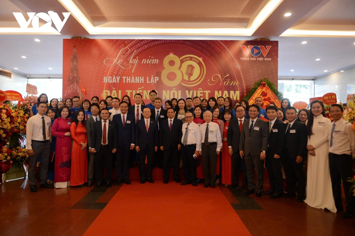 PM Pham Minh Chinh berfoto bersama dengan pimpinan dan para staf VOV (Foto: VOV) |