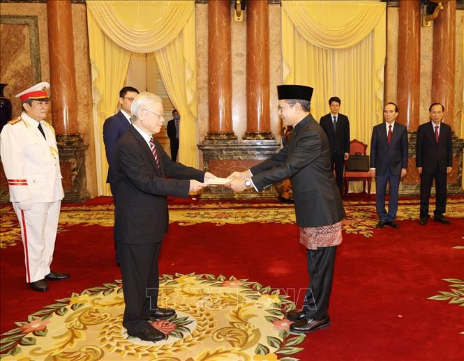 Dubes Denny Abdi menyampaikan surat mandat kepada Sekjen Nguyen Phu Trong pada tahun 2021 (Foto: VNA) |