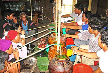 Benda pemujaan untuk upacara ini terdiri dari satu cangkir arak, satu ekor ayam jantan, satu buah terong pahit, satu daun jambu biji hutan dan satu cangkir perunggu. Setelah pemberian nama, bayi itu akan dikasih makan hati ayam, pemimpin upacara mencelupkan daun jambu biji pada tetesan embun kemudian diusapkan pada bibir bayi supaya bayi ini di kemudian hari akan menjadi gagah berani dan kuat. Kalau sudah dewasa, dia akan mengadakan upacara naik dewasa supaya mendapat pengakuan dari warga sebagai seorang laki-laki dewasa di dukuh dan desa.
