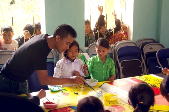 Seorang pelukis sedang mengajar pelukis bagi anak-anak di daerah pegunungan (Foto: bienphong.com.vn) |