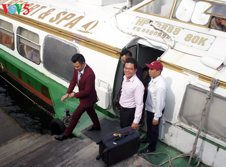 Kapal express membawa wisatawan dari pelabuhan Binh ke Cat Ba. |