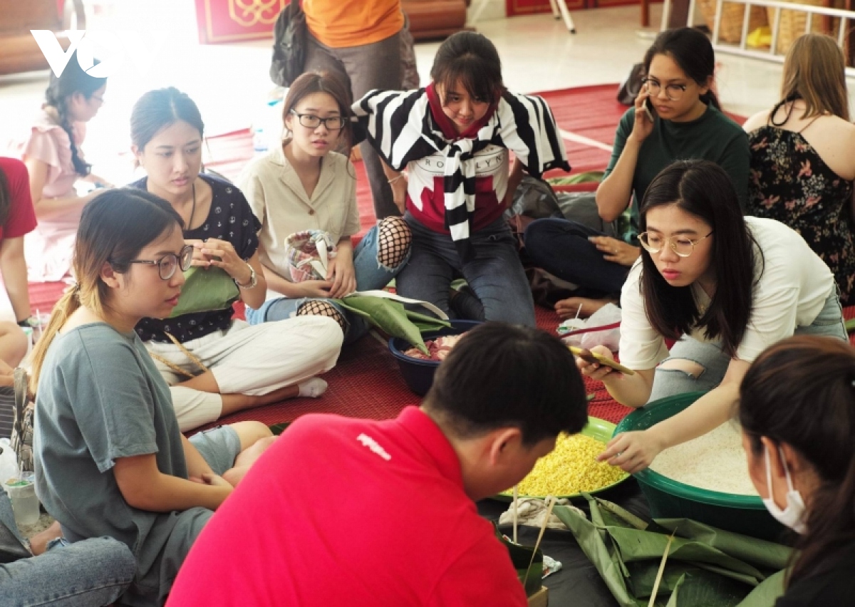 Pusat Bahasa dan Ilmu Pengetahuan Tentang Vietnam di Bangkok menyelenggarakan kegiatan masyarakat membungkus Kue Chung (Foto : VOV) |
