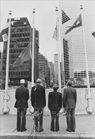 Setelah kemenangan Revolusi Agustus, Vietnam secara proaktif dan aktif melakukan integrasi internasional secara komprehensif, turut meningkatkan posisi dan prestise di kancah internasional. Dalam foto: Upacara pengibaran bendera Vietnam di Markas Besar Perserikatan Bangsa-Bangsa (PBB) pada tanggal 20 September 1977, menandai peristiwa Vietnam resmi menjadi anggota PBB. Foto: dokumen VNA