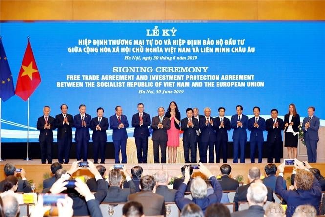 Acara penandatanganan Perjanjian Perdagangan Bebas dan Perjanjian Proteksi Investasi antara Vietnam dan Uni Eropa (EVFTA dan EVIPA), 30 Juni 2019. Foto: VNA