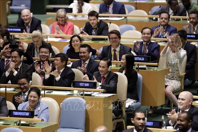 Kegembiraan para anggota delegasi Vietnam saat terpilih menjadi anggota tidak tetap DK PBB periode 2020-2021 dengan jumlah suara yang hampir mutlak (Juni, 2019). Foto: VNA