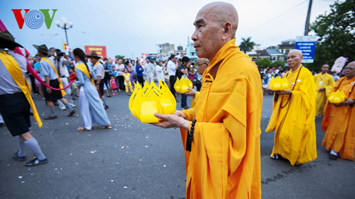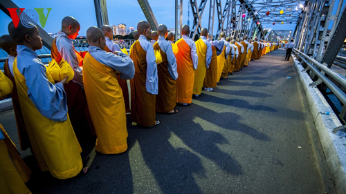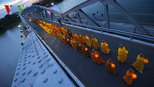 (VOVworld) - Sehubungan dengan Mega Upacara Waisak Perserikatan Bangsa-Bangsa 2014 yang diadakan di kota Hue, provinsi Thua Thien Hue Vietnam telah berlangsung ritual mengarak Buddha. Dalam kerangka aktivitas ini juga diadakan ritual memohon negara damai, rakyatnya tenteram, dunia damai. Upacara ini menyerap partisipasi dari kehadiran kira-kira 10.000 peserta yang adalah biksu-biksuni, kaum buddhis, penduduk kota Hue beserta pengunjung dalam dan luar negeri.