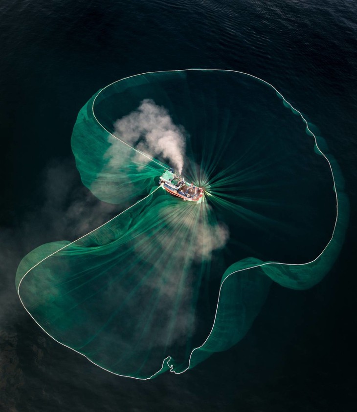 Foto "Menjaring pada dini hari" oleh Nguyen Ngoc Thien memenangkan hadiah kedua dalam kategori fotografi udara 35AWARDS. Karya tersebut menangkap sebuah perahu nelayan yang sedang menarik jaringnya selama musim penangkapan ikan teri di perairan Tuy Hoa, Provinsi Phu Yen.