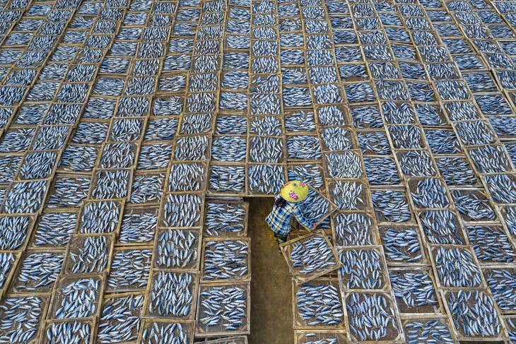 Foto "Menjemur ikan layang" dari fotografer Khanh Phan memenangkan kategori Terbuka (Open" Foto Pariwisata dari "Sony World Photography Awards 2021" (SWPA). Dalam foto adalah seorang gadis sedang menjemur nampan-nampan ikan layang terakhir di pasar Long Hai, Provinsi Ba Ria - Vung Tau.
