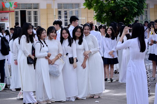 | Sejak dini, para pelajar telah hadir di sekolahan dengan busana seragam dan “ao dai” yang putih bersih (baju panjang tradisional Vietnam untuk perempuan). |