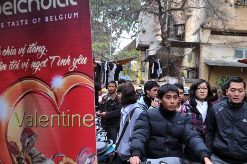 Pada hari-hari ini, di jalan-jalan di kota Hanoi seperti: Ton That Tung, Cau Giay, Hang Buom, Thai Ha, Chua Boc, dll kelihatan berbagai jenis kado untuk kebutuhan Hari Valentine. Kotak-kotak permen coklat, boneka beruang, bantal berbentuk jantung, barang berpasangan seperti gelas keramik, kerangka foto, dll dijual dimana-mana untuk melayani kebutuhan dari pemuda-pemudi ibukota. Di satu toko suvernir di jalan Ton That Tung, banyak orang sedang mencari kado untuk belahan hatinya. Dengan raut muka yang cerah kemerah-merahan dari seorang yang sedang dirundung asmara, saudara Vuong Duc An, pegawai Ocean Bank, memberitahukan: "Valentine adalah satu hari yang istimewa. Orang yang belum punya pasangan semuanya akan terasa membutuhkan seorang kekasih. Asmara bisa ada di mana-mana saja di planit ini, siapa saja juga ingin mencintai dan dicintai. Saya ingin membeli satu kado kecil untuk pacar saya pada hari Valentine”.