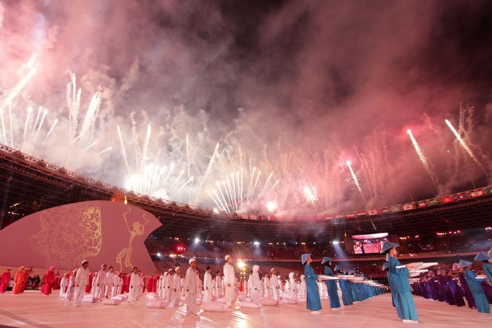 Yang menjelujuri upacara tersebut ialah pertunjukan yang kolosal, gembira dan menyerap perhatian puluhan juta rakyat Indonesia serta di seluruh kawasan. (Foto :AFP/VNA)