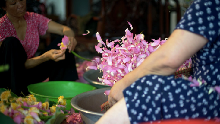 Teh yang diberi aroma bunga teratai merupakan satu kenangan yang khas dari bumi Ibukota yang sudah punya sejarah kebudayaan ribuan tahun. Berbaurnya antara rasa manis yang halus dari sejenis teh dengan aroma yang murni dan jernih dari bunga teratai di Danau Tay (atau Danau Barat) telah mempesonakan hati orang dan menjadi satu kebanggaan orang Hanoi. Untuk bisa membuat satu teko teh yang enak rasanya, maka artisan perlu melaksanakan banyak tahapan, dari memetik bunga teratai pada pagi hari, melepaskan kepala sari sampai merendam teh. Wartawan Tu Anh menyediakan waktu sehari untuk mengikuti para artisan untuk menguak-tabir tahapan-tahapan merendam teh hijau dengan bunga teratai Danau Tay