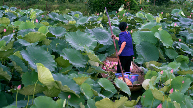 Pada bulan-bulan Juni dan Juli, para pemetik akan memetik bunga teratai sampai satu sampan penuh seperti ini |