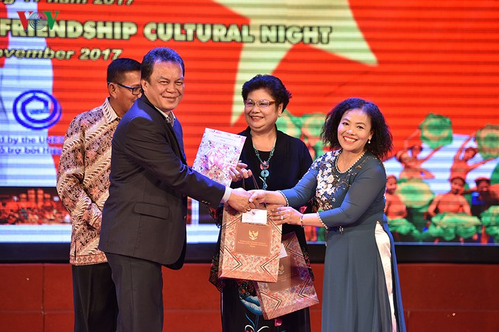 Wakil KBRI menyampaikan hadiah kepada Sutradara Umum program kesenian ini, Jurnalis VOV Truong Thi Tu Thuy |