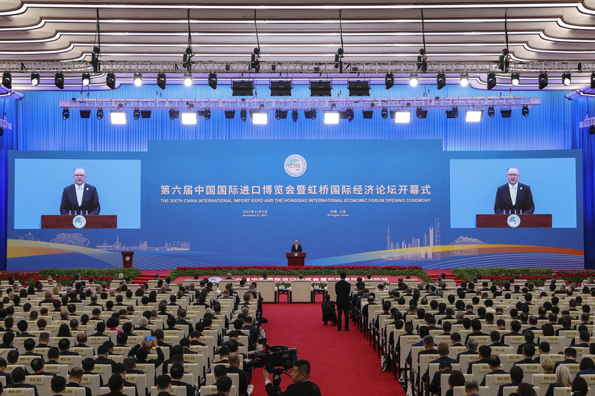 PM Anthony Albanese berbicara di Pekan Raya Barang Impor Tiongkok di Shanghai pada 5 November (Foto: Jin Liwang/Xinhua/AP) |