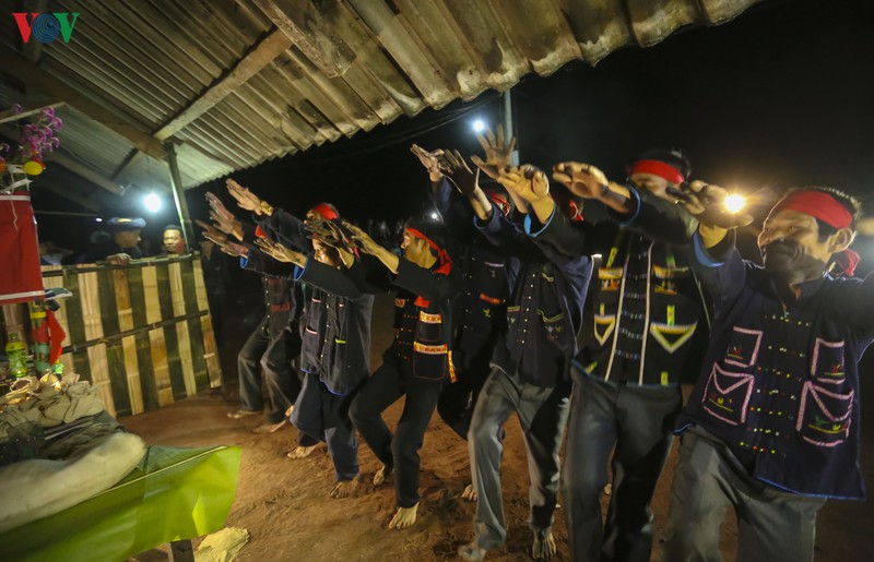 Untuk menyiapkan upacara ini, di nampan sajian harus ada diantaranya: Satu kepala babi (atau babi kecil), mangkok dupa, air, miras dan 5 cangkir, kertas Do yang mewakili emas dan perak di dunia baka, kartu Yin dan Yang, dua koin perak, beras yang telah dibungkus dalam tas kain dan sebagainya. Ketika semua benda sajian telah disiapkan lengkap, saat yang paling baik sudah tiba, di bawah kepemimpinan dukun utama dalam pakaian tradisional dari etnis-nya, upacara tersebut diadakan di depan altar nenek-moyang dan nampan sajian. Selama proses ini, genderang dan bonang merupakan instrumen musik penting yang tidak bisa kurang, suara musik dianggap sebagai jembatan penghubung yang membantu para Dewa tiba untuk bersama-sama turut bergembira dengan para warga dukuh. Upacara ini sangat penting, maka dilaksanakan berulang kali dengan banyak protokol.