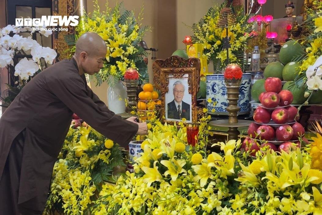 Di Pagoda Lai Da, warga dan pemimpin pagoda dengan khidmat membentuk altar untuk mengenangkan Sekjen Nguyen Phu Trong. (Foto: VTCNews) |