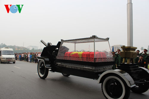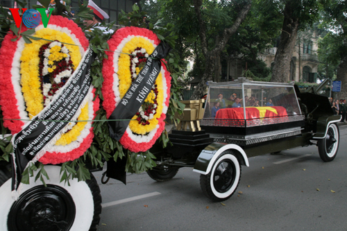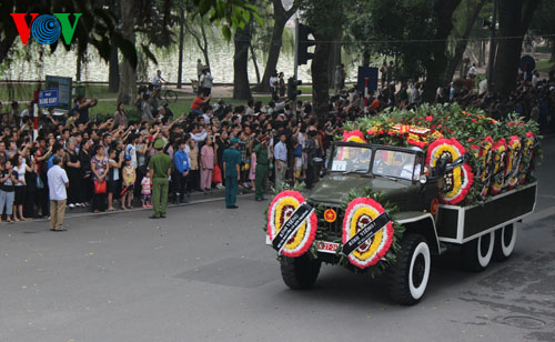 | Xe chở linh cữu Đại tướng qua nhà riêng tại 30 Hoàng Diệu |
