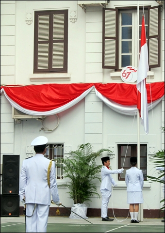 | Bapak Samsudin - Konselor KBRI di Hanoi membacakan teks Panca Sila |