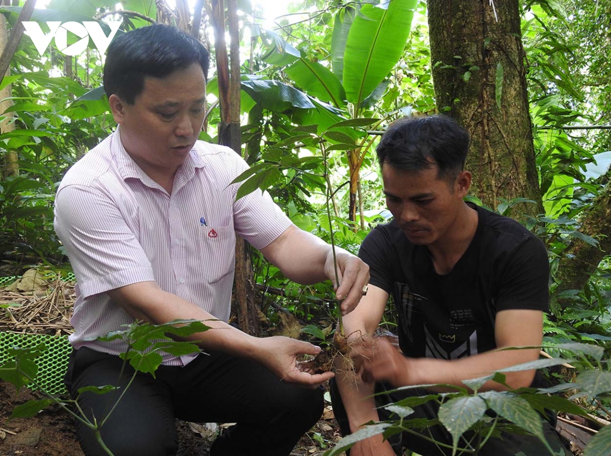 Saudara Alinh memeriksa pohon ginseng Ngoc Linh keluarganya (Foto: vov) |