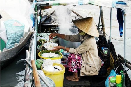 ガーナム水上マーケットで、売り手と買い手はいずれも小舟に乗っています。ここでは、朝3,4時頃にはすでに多くの船が集まってきて、7時~8時頃まで開かれます。この水上マーケットで商売をするフン・テイ・フオン ( Phung Thi Phuong) さんは次のように語りました。