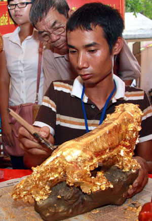 ボンさんによりますと、製造工程は手先の器用さと精密さが求められます。一つの製品を作るためには、およそ40の工程があります。金箔の製造工程は澄屋(ずみや)が行う延金(のべきん)、上澄(うわずみ)と箔屋(はくや)が行う箔打ちに分業して行われることになります。対句や漆絵、瓶などの精巧な製品を金箔で製造するため、時間がかなりかかります。そのため、観光客はキェウ・キ村を訪れますと、製造工程に関心を常に払っています。ガイドのグェン・スァン・バク(NGUYENXUANBACH)さんは次のように語りました。「テープ」