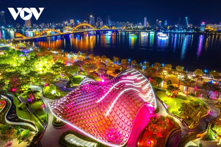 | ロン橋のそば、ハン川沿いに位置するAPEC公園は、上空から見ると華やかに輝く |
