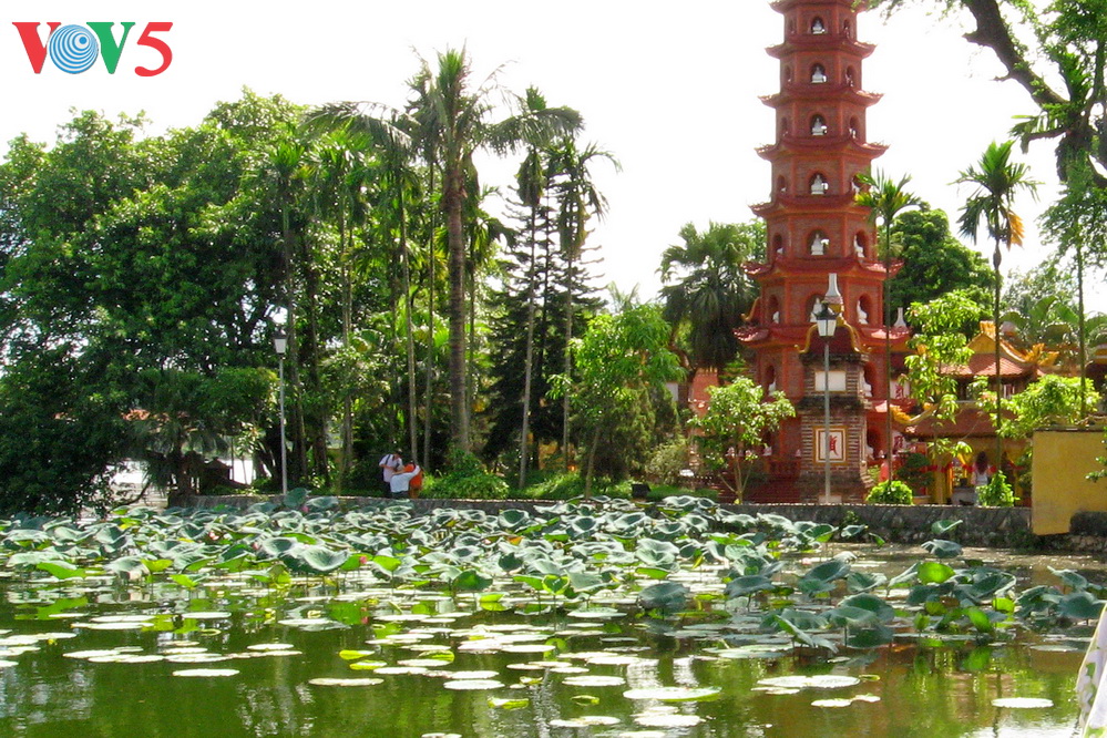 ハノイ市内最古の仏教寺院チャンクォク寺(鎮国寺)はハノイの最大の湖「西湖」に突き出た小島にあり、お寺の中の風景と周りの景色との調和を誇りにしています。また、境内に植えられた菩提樹 は、お釈迦様が悟りをひらくときに根元に座った木の枝から植えられたものであるとされています。