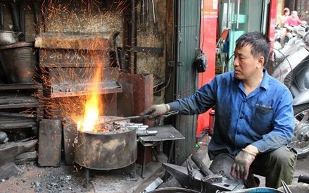 昔、ハノイ郊外にあった鍛冶職人の村からやってきた人たちがこの通りをつくりました。以前は、みんな鉄を打って金属製品を作っていましたが、現在では、機械を使っての製造や既成品の金属製品店になっています。