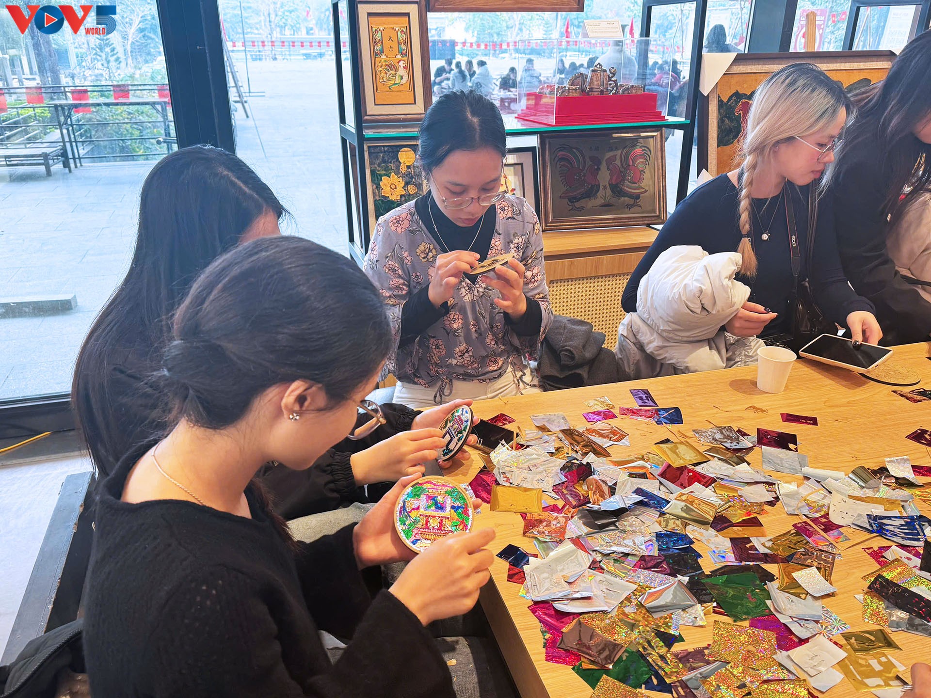 博物館1階で陶芸や絵画体験に参加する若者たち(写真:Thủy Tiên/VOV1) |