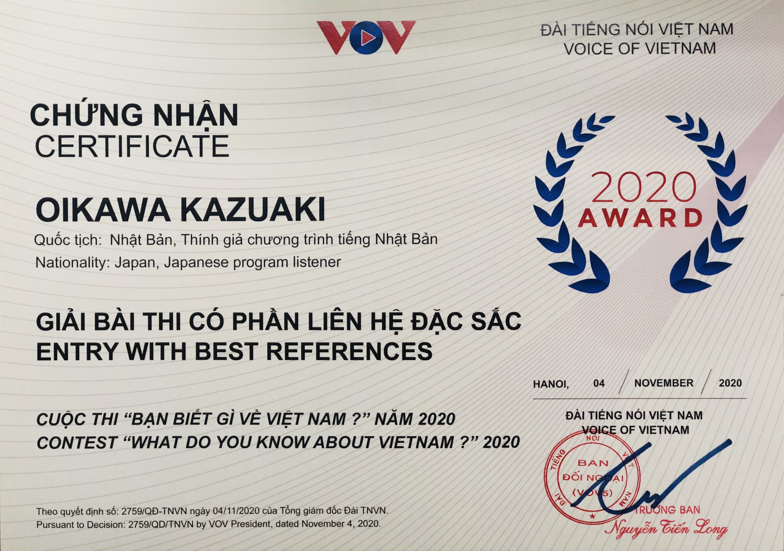 (VOVWORLD) - 現在、新型コロナウイルス感染症の影響により、郵送が難しいですが、証明書ができるだけ早く及川さんの元へ届けられるように取り組みます。