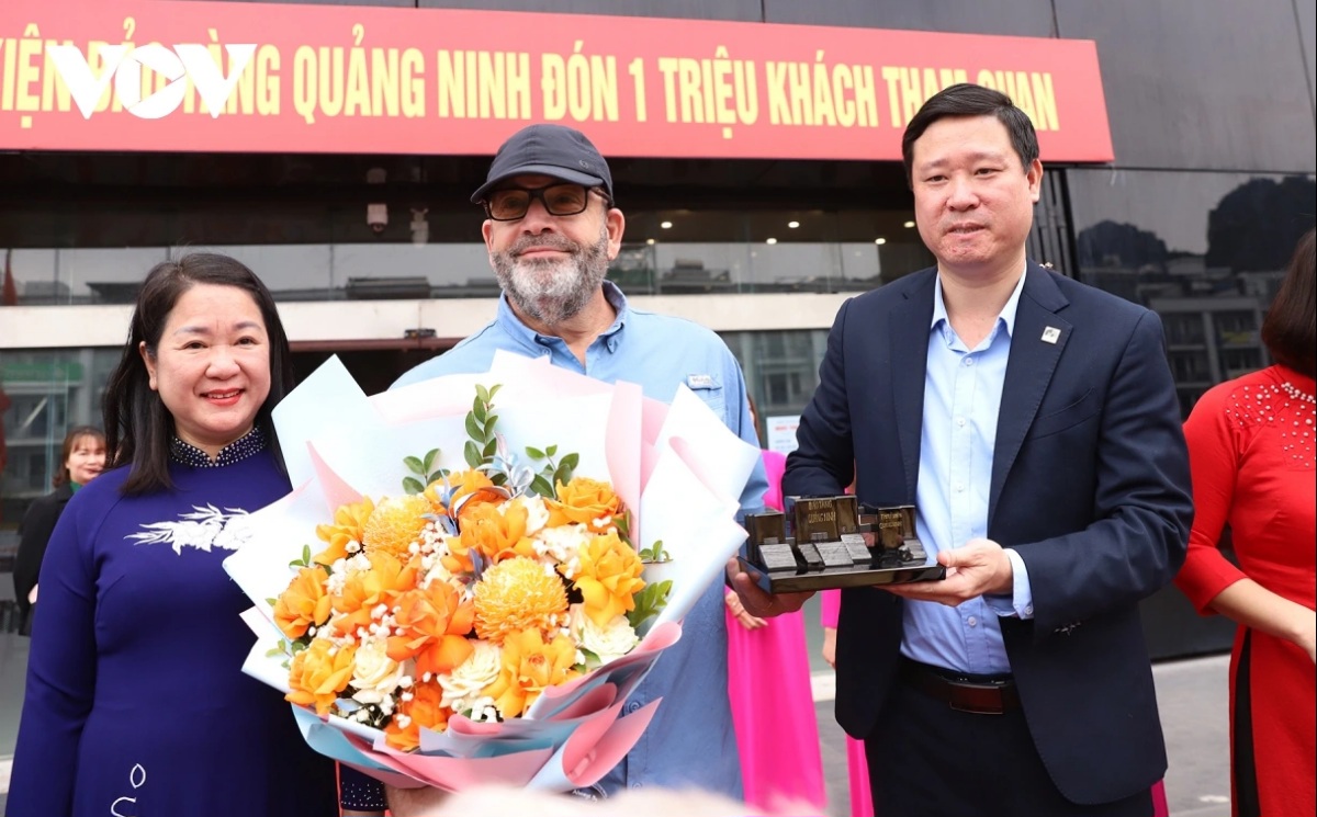 2025年にクアンニン省博物館を訪れた100万人目の来館者となったカナダ人観光客、リオネル・クロッツさん(真ん中)が、博物館の関係者から記念品を受け取る(写真:VOV) |