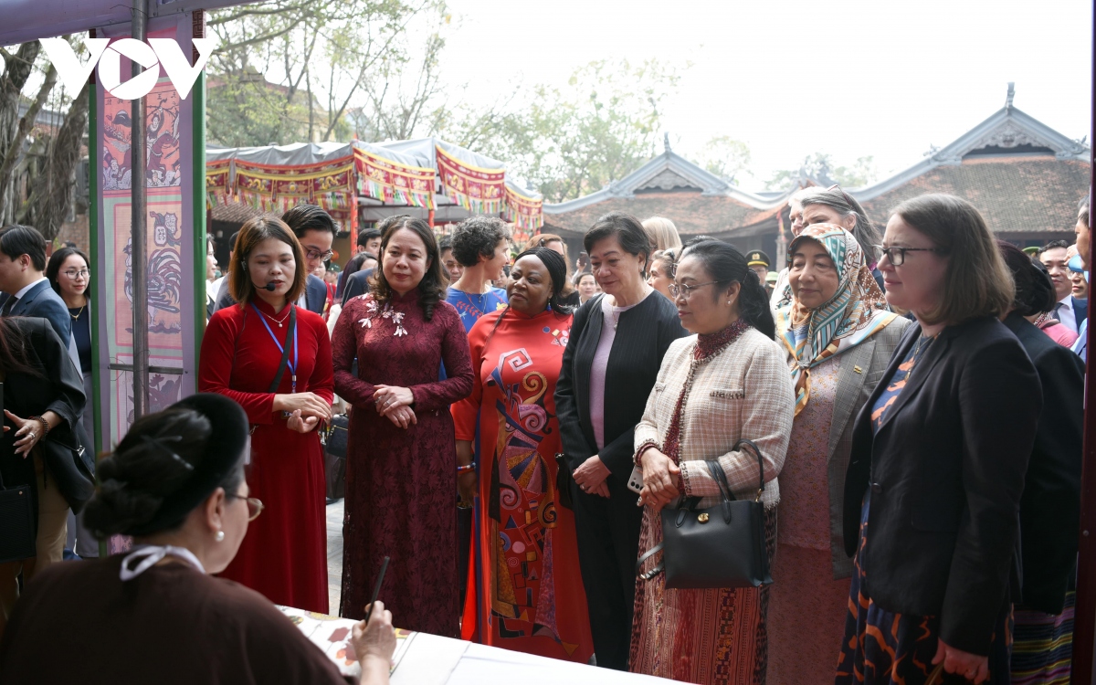 ベトナムの伝統的版画の展示会を楽しんでいるスアン国家副主席と在ベトナム各国の女性大使ら |