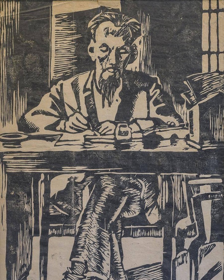 | 1999年に製作された画家グエン・チョン・ホップの木版画「ホーおじさんの写真を見る」 |