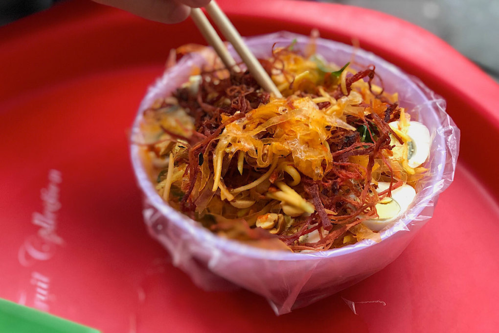 ソン 路上で売られており、若者たちに人気のおやつであるこの料理は、 細切りにしたライスペーパーに線切りの青いマンゴー、うずらの卵、エビ、パクチー、煎ったピーナッツ、甘い酸っぱいタレなどの色んな具材を混ぜ合わせて作られたものです。