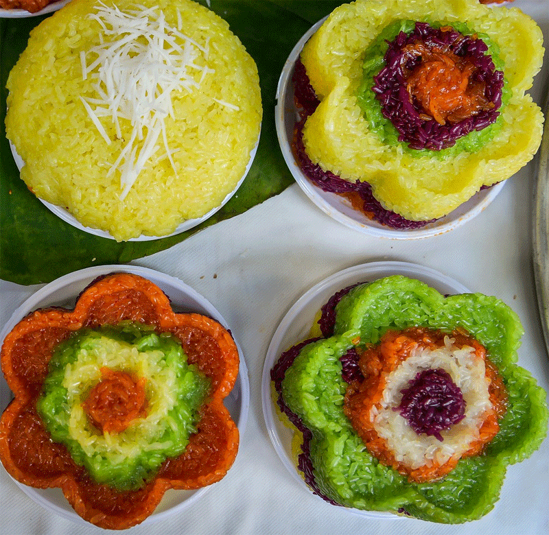 ソン さらに、観光客は、もち米で作られた各種おこわを味わうこともできますね。例えば、ナンバンカラスウリのおこわ「ソイガック(Xoi Gac)」、ピーナッツのおこわ「ソイラック(Xoi Lac)」、緑豆のおこわ「ソイダウサン(Xoi Dau Xanh)」、トウモロコシのおこわ「ソイゴー(Xoi Ngo)」など色々ありますよ。