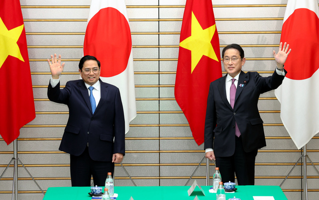 ベトナムのファム・ミン・チン首相(左)と日越首脳会談に臨む岸田文雄首相=朝日新聞 |