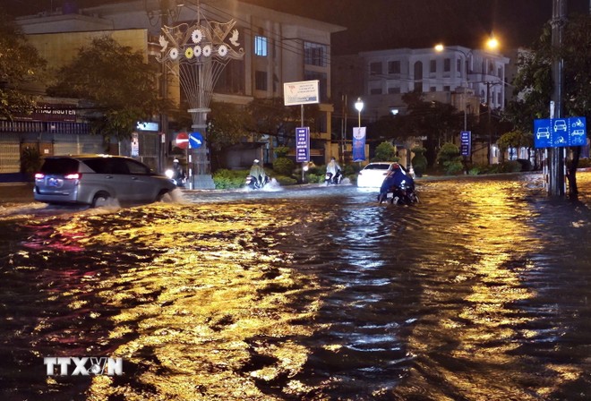 南部ソクチャン省ソクチャン市で大雨と大潮の影響によって多くの道路が浸水した(Trung Hiếu/TTXVN) |