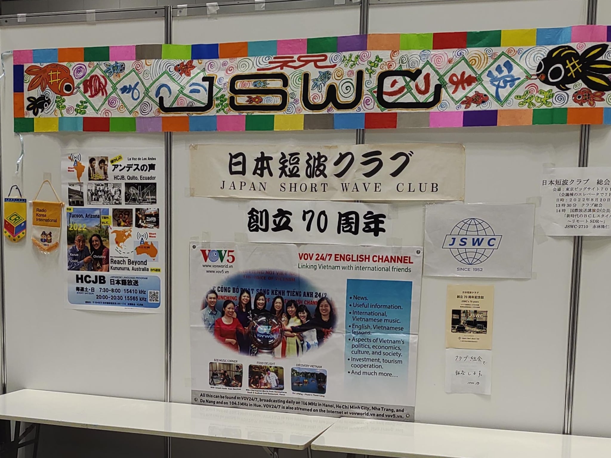 2022年のハムフェアにおける日本短波クラブのブース。中央にVOVのポスターが掲示されている(写真提供:うえむら・あきお) |