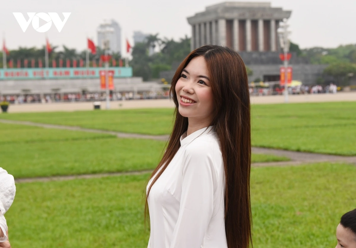 アオザイを着てバーディン広場で記念撮影する女性(写真:Trọng Phú/VOV.VN) |