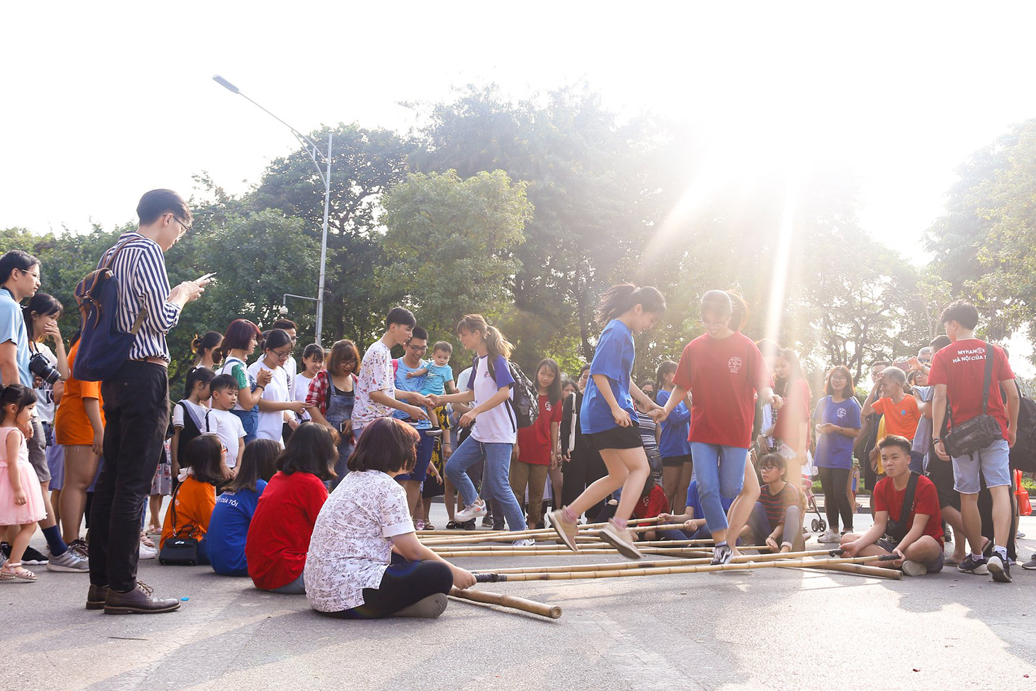 ハノイの歩行者天国でよく催されている昔ながらの遊びは、「ムア・サップ」の他、「オーアンクアン」、「ゴム飛び」、「大縄跳び」、「長引き」、「竹馬」などです。ゴム飛びや長引きなどは体力を求めますが、オーアンクアンは頭脳ゲームです。カルキ一本か煉瓦一個と大きな石、小さい石と小さな庭だけで面白くて楽しい遊び方です。盤は10個の小さな正方形(庶民のエリア)に分けられた長方形で両側はそれぞれが5つの正方形があります。盤の両端は半月の形(官僚のエリア)2つがあります。ゲームの終わりには庶民に換算されるチェスのこまを持っている人が勝ちです。かつて子供たちなら誰でも一回はやったことがある遊びですが、現在はできる子が少ないです。しかし、マイ・ハノイ・クラブの指導を受けて、多くの子どもたちがオーアンクアンを楽しむことができるようになりました。