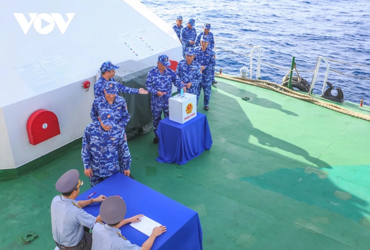 海上で任務にあたるベトナム海上警察や漁業監視部隊の隊員にとって、第16期国会議員選挙と2026~2031年任期の各級人民評議会議員選挙は、広い海の上で行われました。隊員一人ひとりの手に投票用紙を届けるため、荒波や強風の中を進む航海が続きました。海から本土へ送られる一票一票には、国民としての権利だけでなく、海を守る意志や責任、そして強い使命感が込められています。