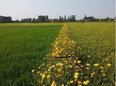 このモデルは「バイオテクノロジーによる稲の害虫管理」プログラムの一環として、IRRI=国際稲研究所により、南部ティエンザン省のカイライ県とカイベ県で、2009年~2010年の冬春期作に初めて導入されました。その目的は稲田の境界のあぜに栽培される花がついた植物の増加や農薬の使用中止にあります。このモデルを導入する農民は田んぼの周りのあぜに様々な花を植えて、手解きされます。