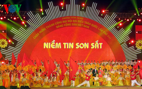 28日夜、ハノイで、中央宣伝教育委員会、党中央委員会事務局、文化スポーツ観光省は共同で第12回党大会の成功を祝って文芸公演を開催し、およそ1500人の俳優、芸術家が参加しました。