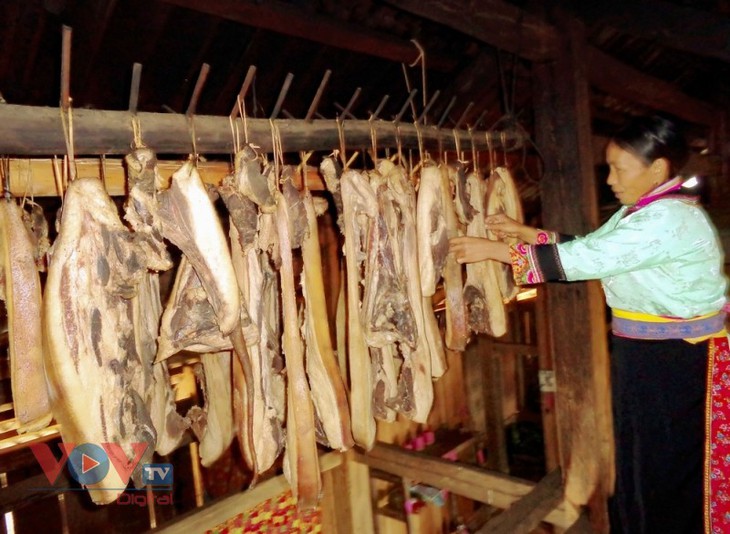 サフアン族のテトに食べる料理には燻製豚肉が欠かせません。サフアン族の人々はテトの1か月前から、豚肉を用意しました。サフアン族の一人の話です。