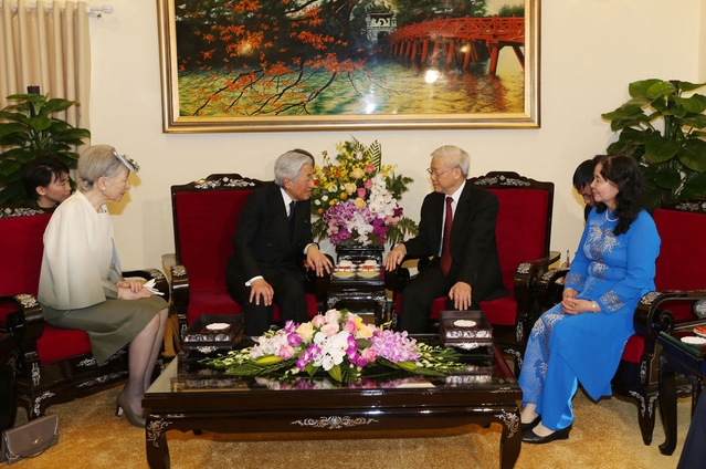 3日午後、ハノイで、グエン・フ・チョン共産党書記長夫妻はベトナムをご訪問中の天皇皇后両陛下と会見しました。席上、チョン書記長は天皇皇后両陛下のご訪問に喜びの意を表明するとともに、初めてのベトナムご訪問は両国関係の新たな発展を記すものとなると強調しました。