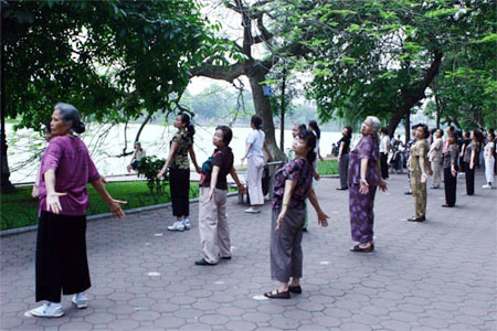 ハノイ中心部にあるホアンキェム湖でラジオ体操をしている人々
