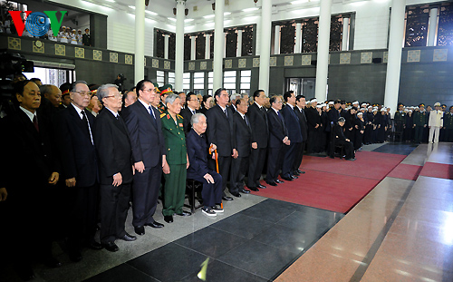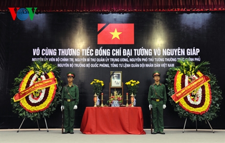 追悼式で、グエン・フー・チョン共産党書記長は弔文を読み上げ、その中で、「ザップ将軍の逝去は党、国家、人民軍、国民、及び家族の大きな損失となっている」と強調するとともに、「80年間あまりにわたって輝いていた革命事業で、ザップ将軍は党と民族に多大な貢献をしてきた。ザップ将軍の大活躍はベトナム革命の発展と民族の困難な闘争に繋がって、歴史に重要な節目を印した。30年間にわたり、人民軍総司令官と中央軍事委員会書記として、ザップ将軍は革命的精神を掲げ、軍隊の指揮と戦術の創意工夫の力を発揮し、敵のあらゆる陰謀をも失敗させた。ザップ将軍の名はフランス植民地主義者とアメリカ帝国主義者との闘争勝利、及び民族の祖国建設防衛事業に結び付いている」と言明しました。