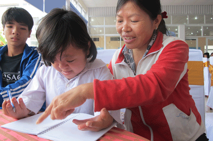 手の手術後の枯葉剤被害者の子供が文字を書けるようになった